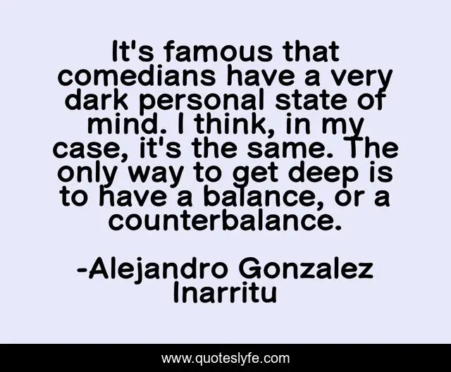 This page presents the quote "It's famous that comedians have a very dark personal state of mind. I think, in my case, it's the same. The only way to get deep is to have a balance, or a counterbalance.". Author of this quote is Alejandro Gonzalez Inarritu. This quote is about balance, mind, deep,.