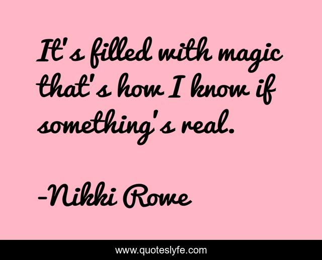 This page presents the quote "It's filled with magic that's how I know if something's real.". Author of this quote is Nikki Rowe. This quote is about magic, intuition, angelic, destiny, fate, euphoric, euphoria, synchronicity, angel,.