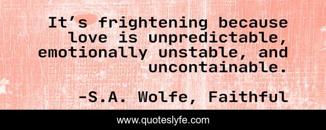 This page presents the quote "It’s frightening because love is unpredictable, emotionally unstable, and uncontainable.". Author of this quote is S.A. Wolfe, Faithful. This quote is about frightening-love, love, affection,.