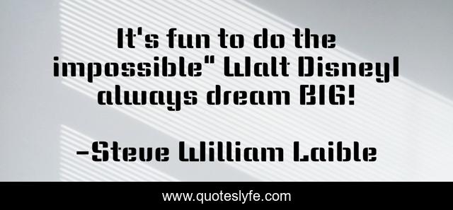 This page presents the quote "It's fun to do the impossible" Walt DisneyI always dream BIG!". Author of this quote is Steve William Laible. This quote is about stevie-tenderheart, inspirational-attitude, inspirational, enthusiasm, steve-laible, walt-disney,.