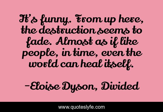 This page presents the quote "It’s funny. From up here, the destruction seems to fade. Almost as if like people, in time, even the world can heal itself.". Author of this quote is Eloise Dyson, Divided. This quote is about world, divided, heal, destruction,.