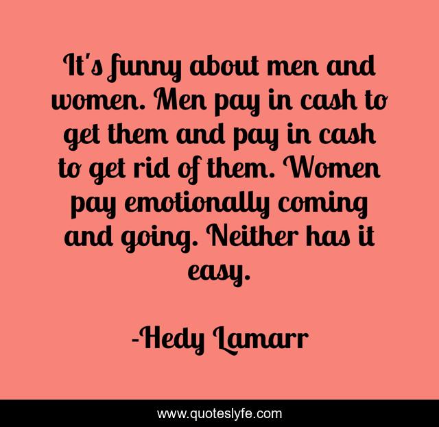 This page presents the quote "It's funny about men and women. Men pay in cash to get them and pay in cash to get rid of them. Women pay emotionally coming and going. Neither has it easy.". Author of this quote is Hedy Lamarr. This quote is about funny, men, comedy, women,.