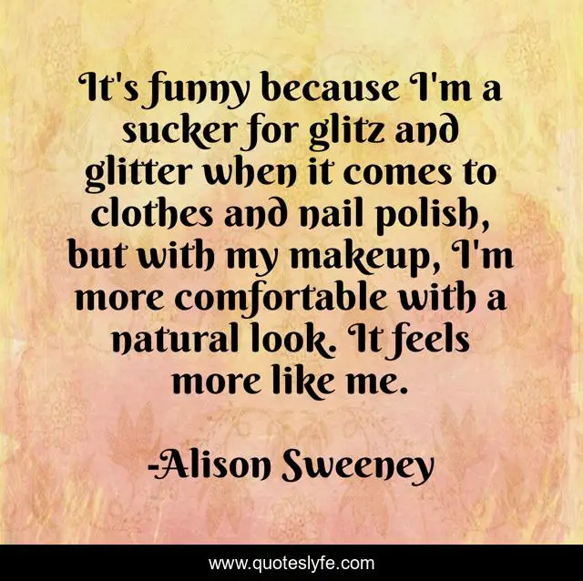 This page presents the quote "It's funny because I'm a sucker for glitz and glitter when it comes to clothes and nail polish, but with my makeup, I'm more comfortable with a natural look. It feels more like me.". Author of this quote is Alison Sweeney. This quote is about me, makeup, clothes,.