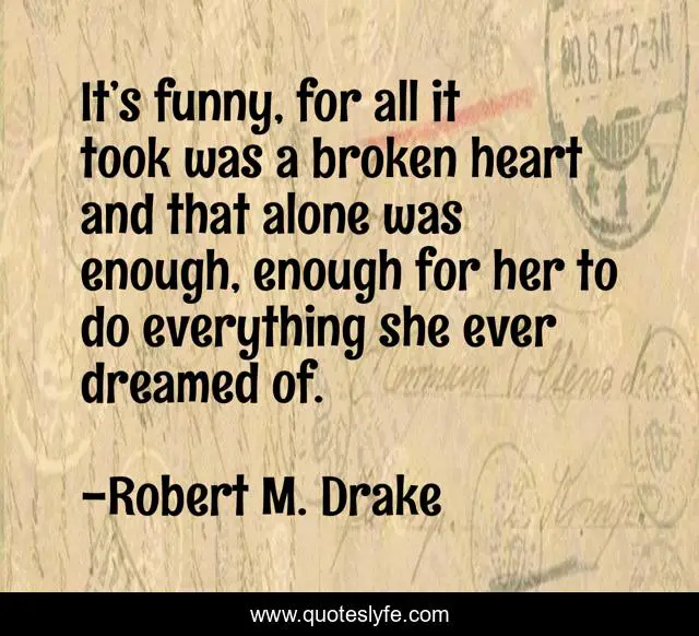 This page presents the quote "It’s funny, for all it took was a broken heart and that alone was enough, enough for her to do everything she ever dreamed of.". Author of this quote is Robert M. Drake. This quote is about lovequotes, sadquotes, poetry, quotes, instadaily, happyquotes, relationships, sayings, writer,.