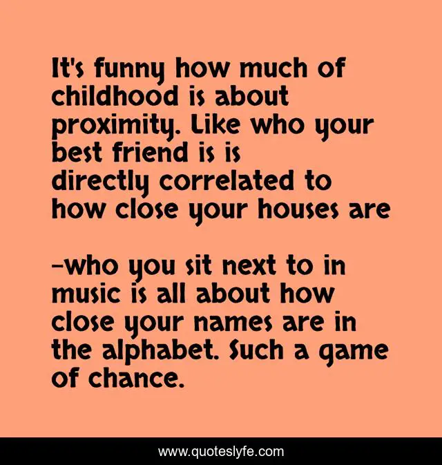 This page presents the quote "It's funny how much of childhood is about proximity. Like who your best friend is is directly correlated to how close your houses are". Author of this quote is who you sit next to in music is all about how close your names are in the alphabet. Such a game of chance.. This quote is about to all the boys i've loved before, jenny han,.