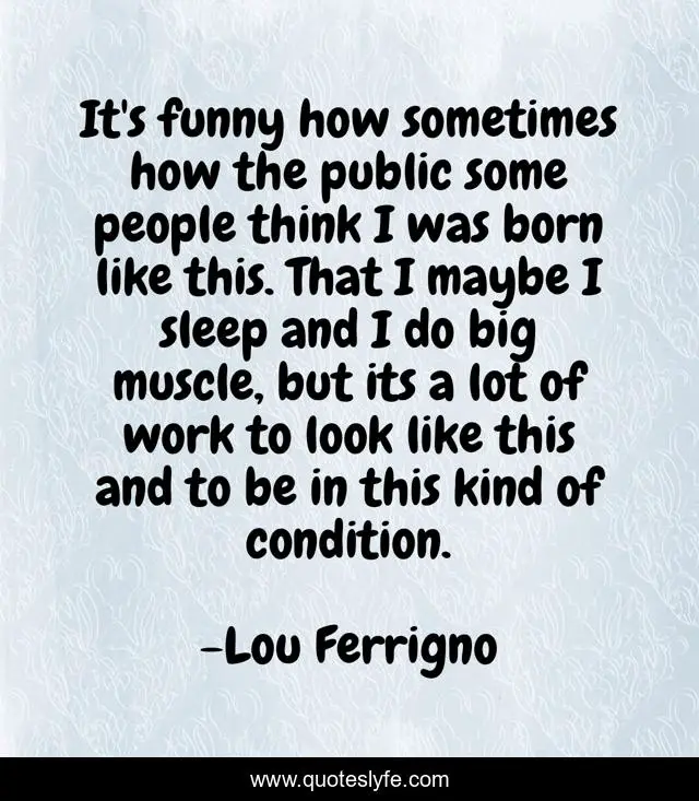 This page presents the quote "It's funny how sometimes how the public some people think I was born like this. That I maybe I sleep and I do big muscle, but its a lot of work to look like this and to be in this kind of condition.". Author of this quote is Lou Ferrigno. This quote is about work, sleep, people,.