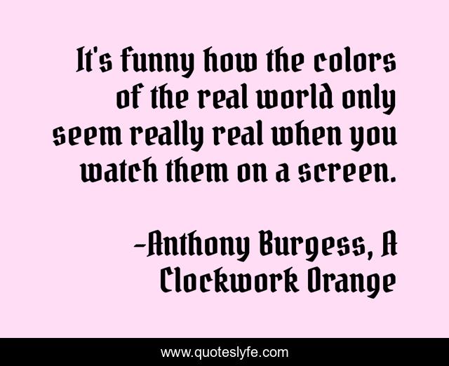 This page presents the quote "It's funny how the colors of the real world only seem really real when you watch them on a screen.". Author of this quote is Anthony Burgess, A Clockwork Orange. This quote is about films, movies, real, reality,.