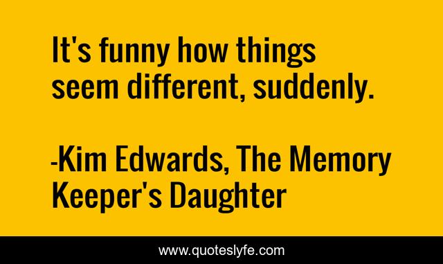 This page presents the quote "It's funny how things seem different, suddenly.". Author of this quote is Kim Edwards, The Memory Keeper's Daughter. This quote is about life, change,.