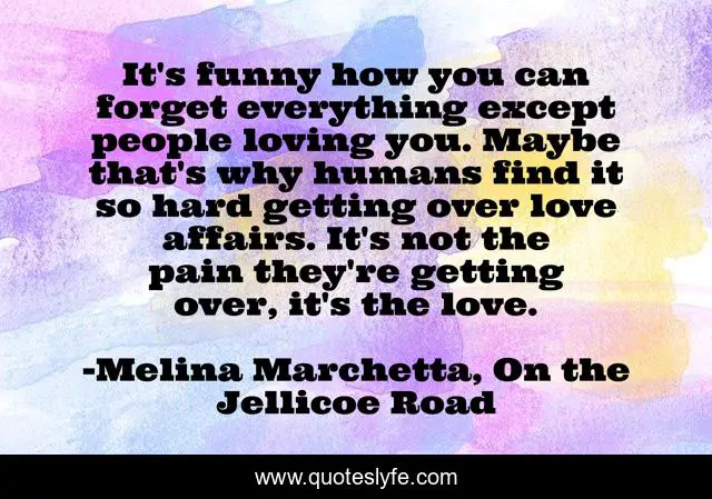 This page presents the quote "It's funny how you can forget everything except people loving you. Maybe that's why humans find it so hard getting over love affairs. It's not the pain they're getting over, it's the love.". Author of this quote is Melina Marchetta, On the Jellicoe Road. This quote is about love, affection,.