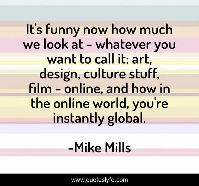 This page presents the quote "It's funny now how much we look at - whatever you want to call it: art, design, culture stuff, film - online, and how in the online world, you're instantly global.". Author of this quote is Mike Mills. This quote is about funny, comedy, art, culture,.