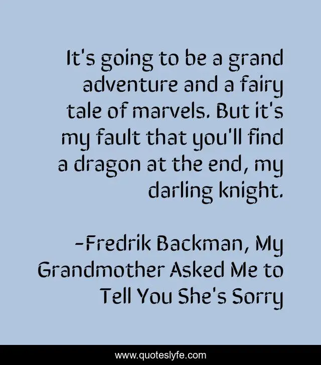 This page presents the quote "It's going to be a grand adventure and a fairy tale of marvels. But it's my fault that you'll find a dragon at the end, my darling knight.". Author of this quote is Fredrik Backman, My Grandmother Asked Me to Tell You She's Sorry. This quote is about grand-adventure, knight, fairy-tale, dragon, grandmother, adventure,.