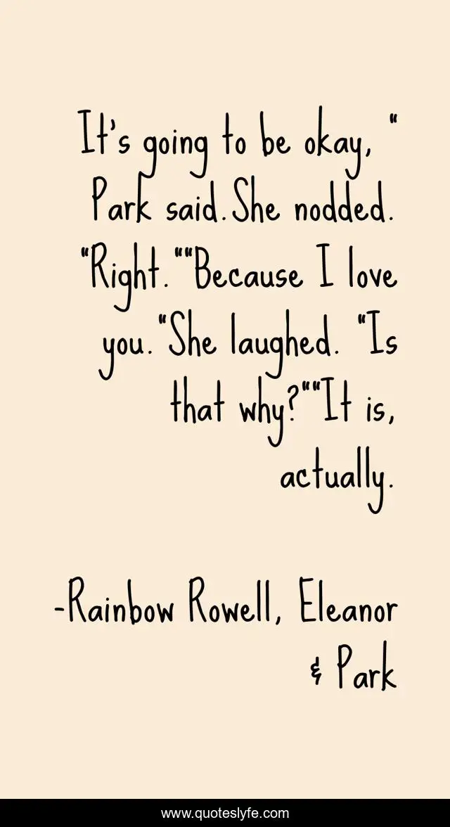 This page presents the quote "It's going to be okay, " Park said.She nodded. "Right.""Because I love you."She laughed. "Is that why?""It is, actually.". Author of this quote is Rainbow Rowell, Eleanor & Park. This quote is about love, teenagers, affection, eleanor-and-park,.