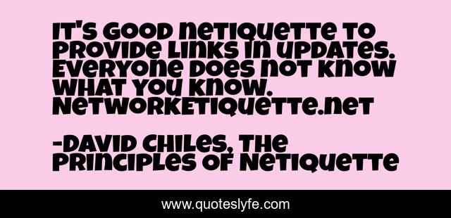 This page presents the quote "It's good netiquette to provide links in updates. Everyone does not know what you know. NetworkEtiquette.net". Author of this quote is David Chiles, The Principles Of Netiquette. This quote is about etiquette, social-media, rules-for-netiquette, social-networking, internet-manners, netiquette, rules-of-netiquette, facebook,.