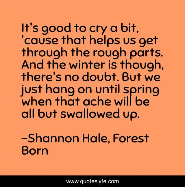 This page presents the quote "It's good to cry a bit, 'cause that helps us get through the rough parts. And the winter is though, there's no doubt. But we just hang on until spring when that ache will be all but swallowed up.". Author of this quote is Shannon Hale, Forest Born. This quote is about hold-on, pain, crying,.
