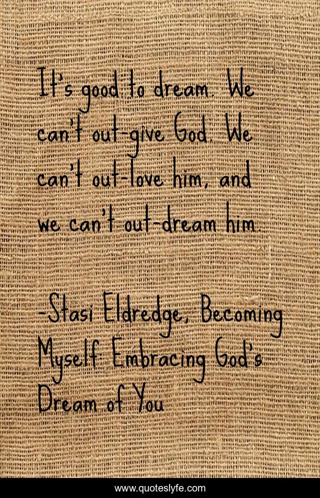 This page presents the quote "It's good to dream. We can't out-give God. We can't out-love him, and we can't out-dream him.". Author of this quote is Stasi Eldredge, Becoming Myself: Embracing God's Dream of You. This quote is about god, desires, dreams, dreaming,.