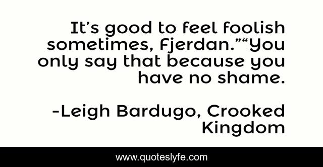 This page presents the quote "It’s good to feel foolish sometimes, Fjerdan.”“You only say that because you have no shame.". Author of this quote is Leigh Bardugo, Crooked Kingdom. This quote is about matthias-helvar, love, nina-zenik, affection, shame,.