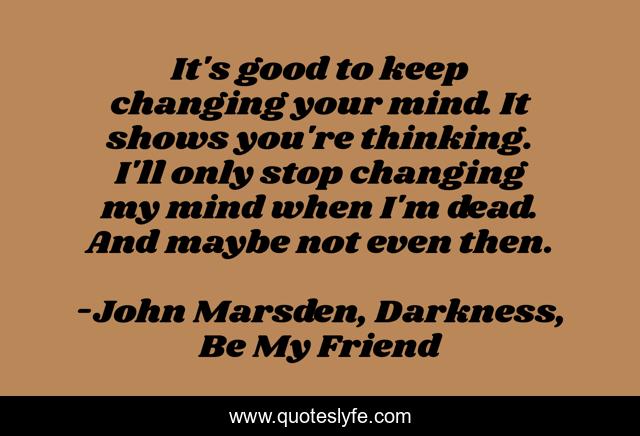 This page presents the quote "It's good to keep changing your mind. It shows you're thinking. I'll only stop changing my mind when I'm dead. And maybe not even then.". Author of this quote is John Marsden, Darkness, Be My Friend. This quote is about thinking, changing,.