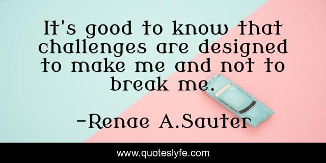 This page presents the quote "It's good to know that challenges are designed to make me and not to break me.". Author of this quote is Renae A.Sauter. This quote is about personal-growth, wisdom, affirmation, mind-body-spirit, inspirational, self-help, enthusiasm,.