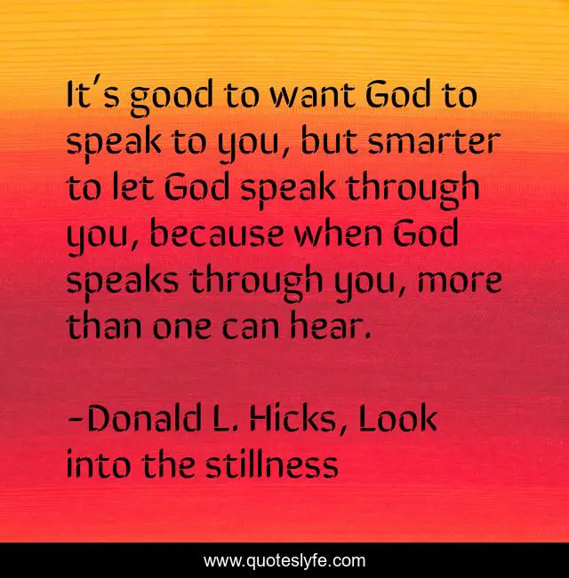 This page presents the quote "It’s good to want God to speak to you, but smarter to let God speak through you, because when God speaks through you, more than one can hear.". Author of this quote is Donald L. Hicks, Look into the stillness. This quote is about god, voice, inspiration, inspirational, enthusiasm,.