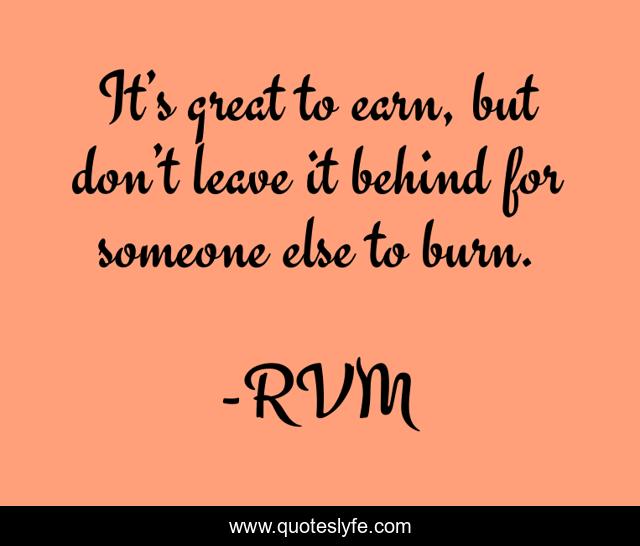 This page presents the quote "It’s great to earn, but don’t leave it behind for someone else to burn.". Author of this quote is RVM. This quote is about motivation, inspiration,.