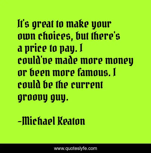 This page presents the quote "It's great to make your own choices, but there's a price to pay. I could've made more money or been more famous. I could be the current groovy guy.". Author of this quote is Michael Keaton. This quote is about money, great, choices,.