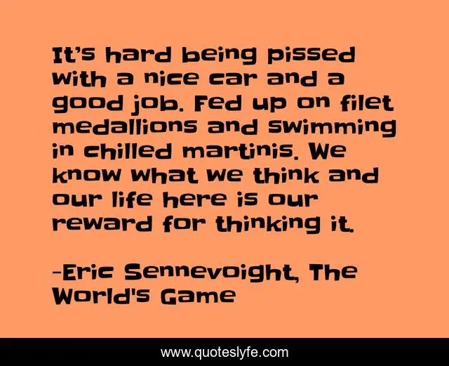 This page presents the quote "It’s hard being pissed with a nice car and a good job. Fed up on filet medallions and swimming in chilled martinis. We know what we think and our life here is our reward for thinking it.". Author of this quote is Eric Sennevoight, The World's Game. This quote is about wealth, selling-out, martinis, politics, reward, conformity,.