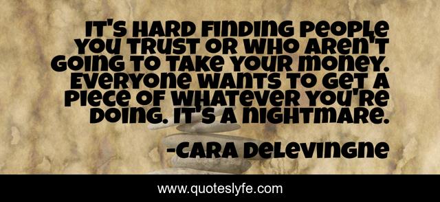 This page presents the quote "It's hard finding people you trust or who aren't going to take your money. Everyone wants to get a piece of whatever you're doing. It's a nightmare.". Author of this quote is Cara Delevingne. This quote is about money, people,.