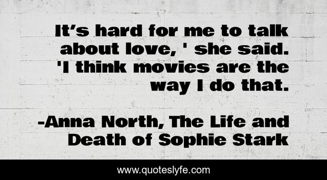 This page presents the quote "It’s hard for me to talk about love, ' she said. 'I think movies are the way I do that.". Author of this quote is Anna North, The Life and Death of Sophie Stark. This quote is about art, creativity, fiction, movies, film, love, affection,.
