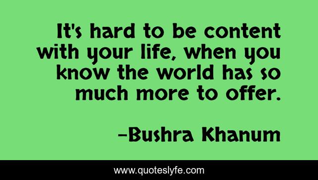 This page presents the quote "It's hard to be content with your life, when you know the world has so much more to offer.". Author of this quote is Bushra Khanum. This quote is about life, offer, hard, satisfied, content, world,.