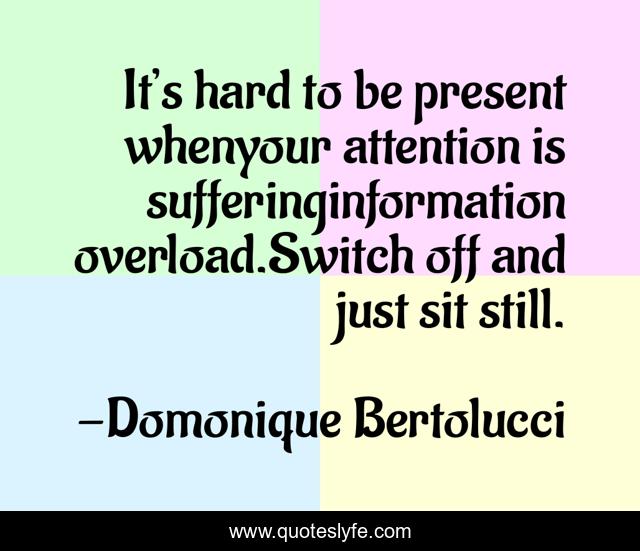 This page presents the quote "It’s hard to be present whenyour attention is sufferinginformation overload.Switch off and just sit still.". Author of this quote is Domonique Bertolucci. This quote is about life-coaching, motivation, how-to-be-happier, life-coach, be-happy, how-to-be-happy, happiness-advice, happiness, be-more-motivated,.