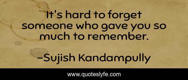 This page presents the quote "It's hard to forget someone who gave you so much to remember.". Author of this quote is Sujish Kandampully. This quote is about love, love-story, affection, love-hurts,.