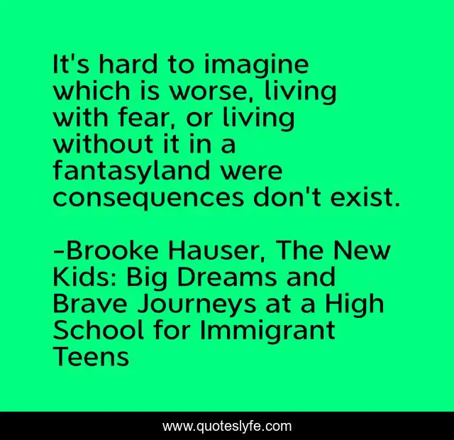 This page presents the quote "It's hard to imagine which is worse, living with fear, or living without it in a fantasyland were consequences don't exist.". Author of this quote is Brooke Hauser, The New Kids: Big Dreams and Brave Journeys at a High School for Immigrant Teens. This quote is about fear, anxiety, denial, reality-therapy,.