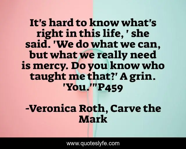 This page presents the quote "It's hard to know what's right in this life, ' she said. 'We do what we can, but what we really need is mercy. Do you know who taught me that?' A grin. 'You.'"P459". Author of this quote is Veronica Roth, Carve the Mark. This quote is about mercy, strength, wisdom, female-characters, carve-the-mark, veronica-roth, divergent,.