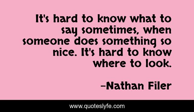 This page presents the quote "It's hard to know what to say sometimes, when someone does something so nice. It's hard to know where to look.". Author of this quote is Nathan Filer. This quote is about reaction, life, people, social,.
