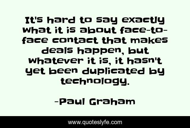 This page presents the quote "It's hard to say exactly what it is about face-to-face contact that makes deals happen, but whatever it is, it hasn't yet been duplicated by technology.". Author of this quote is Paul Graham. This quote is about happen, whatever,.