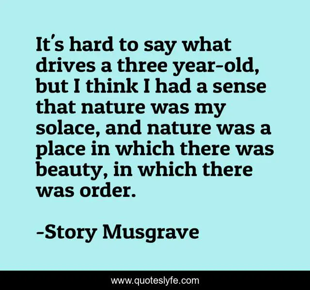 This page presents the quote "It's hard to say what drives a three year-old, but I think I had a sense that nature was my solace, and nature was a place in which there was beauty, in which there was order.". Author of this quote is Story Musgrave. This quote is about think, beauty, three,.