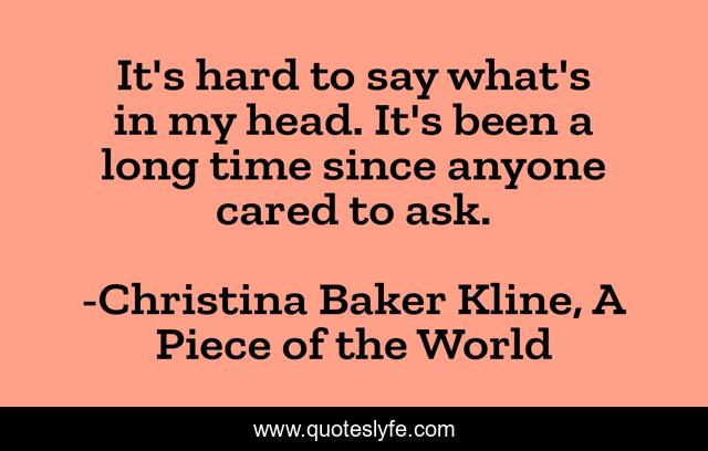 This page presents the quote "It's hard to say what's in my head. It's been a long time since anyone cared to ask.". Author of this quote is Christina Baker Kline, A Piece of the World. This quote is about caring, thoughts-of-the-mind,.