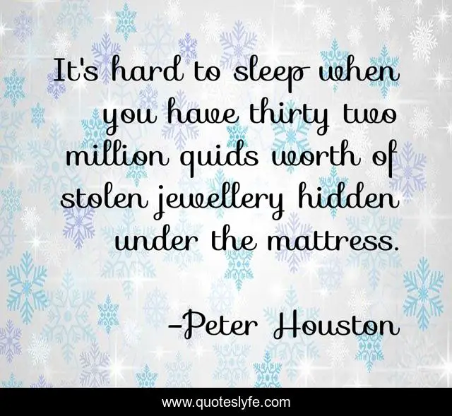 This page presents the quote "It's hard to sleep when you have thirty two million quids worth of stolen jewellery hidden under the mattress.". Author of this quote is Peter Houston. This quote is about enthusiasm, comedy, humor, humour, inspirational,.