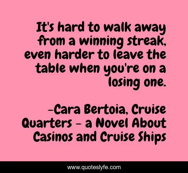 This page presents the quote "It's hard to walk away from a winning streak, even harder to leave the table when you're on a losing one.". Author of this quote is Cara Bertoia, Cruise Quarters - a Novel About Casinos and Cruise Ships. This quote is about romance, gambling, travel, casino, blackjack,.