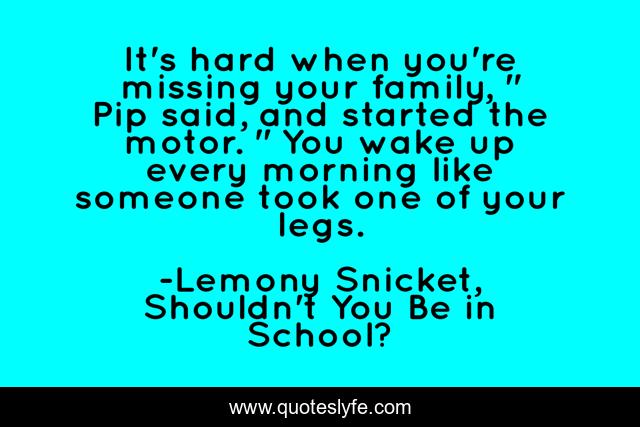This page presents the quote "It's hard when you're missing your family, " Pip said, and started the motor. " You wake up every morning like someone took one of your legs.". Author of this quote is Lemony Snicket, Shouldn't You Be in School?. This quote is about mystery, family,.