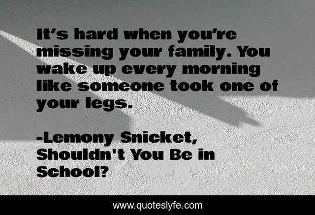 This page presents the quote "It’s hard when you’re missing your family. You wake up every morning like someone took one of your legs.". Author of this quote is Lemony Snicket, Shouldn't You Be in School?. This quote is about family, missing,.