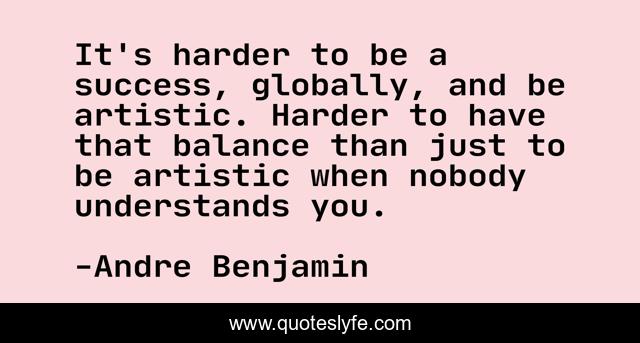 This page presents the quote "It's harder to be a success, globally, and be artistic. Harder to have that balance than just to be artistic when nobody understands you.". Author of this quote is Andre Benjamin. This quote is about balance, nobody,.