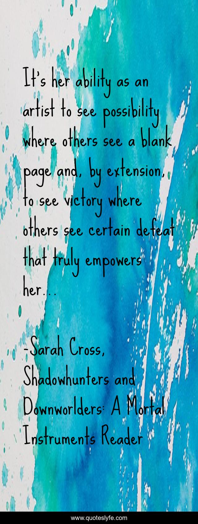 This page presents the quote "It's her ability as an artist to see possibility where others see a blank page and, by extension, to see victory where others see certain defeat that truly empowers her...". Author of this quote is Sarah Cross, Shadowhunters and Downworlders: A Mortal Instruments Reader. This quote is about clary-fray, courage, art, strength, hope,.
