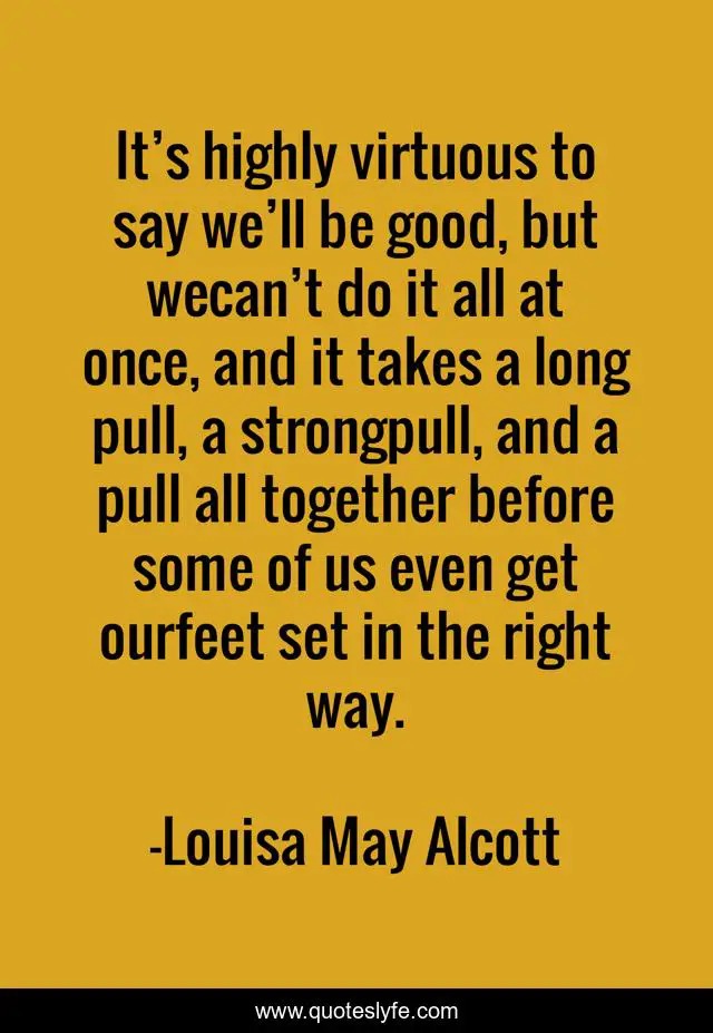 This page presents the quote "It’s highly virtuous to say we’ll be good, but wecan’t do it all at once, and it takes a long pull, a strongpull, and a pull all together before some of us even get ourfeet set in the right way.". Author of this quote is Louisa May Alcott. .