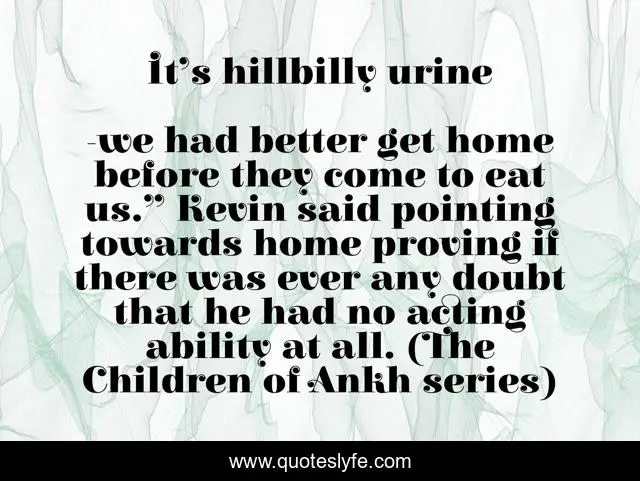 "we had better get home before they come to eat us.” Kevin said pointing towards home proving if there was ever any doubt that he had no acting ability at all. (The Children of Ankh series) Quotes." Quoteslyfe.com, 2025. Mon. 08 Dec. 2025. <https://www.quoteslyfe.com/quote/It-s-hillbilly-urine-205850>.