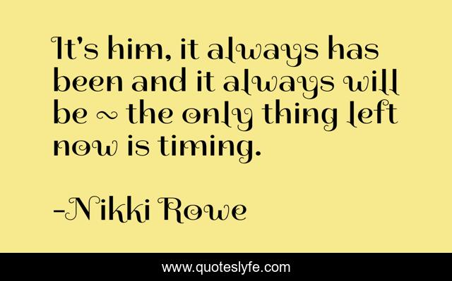 This page presents the quote "It's him, it always has been and it always will be ~ the only thing left now is timing.". Author of this quote is Nikki Rowe. This quote is about true-love, trust-the-timing-of-your-life, love, twin-flame-love, beginnings, spiritual-connection, twin-flame, growth, timing,.