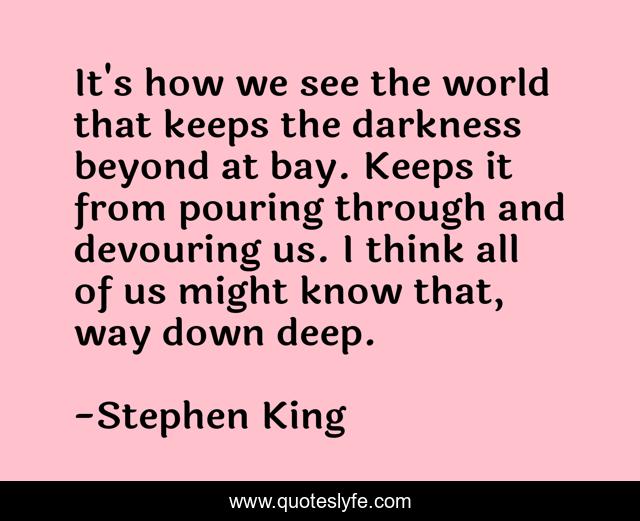 This page presents the quote "It's how we see the world that keeps the darkness beyond at bay. Keeps it from pouring through and devouring us. I think all of us might know that, way down deep.". Author of this quote is Stephen King. .