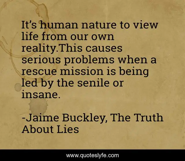 This page presents the quote "It’s human nature to view life from our own reality.This causes serious problems when a rescue mission is being led by the senile or insane.". Author of this quote is Jaime Buckley, The Truth About Lies. .