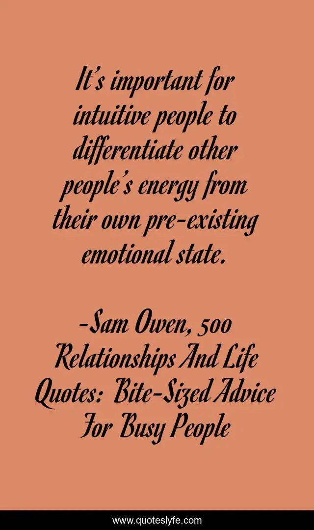 This page presents the quote "It’s important for intuitive people to differentiate other people’s energy from their own pre-existing emotional state.". Author of this quote is Sam Owen, 500 Relationships And Life Quotes: Bite-Sized Advice For Busy People. This quote is about relationships, intuition, intuitive, emotional-state, pre-existing, emotions, differentiate,.