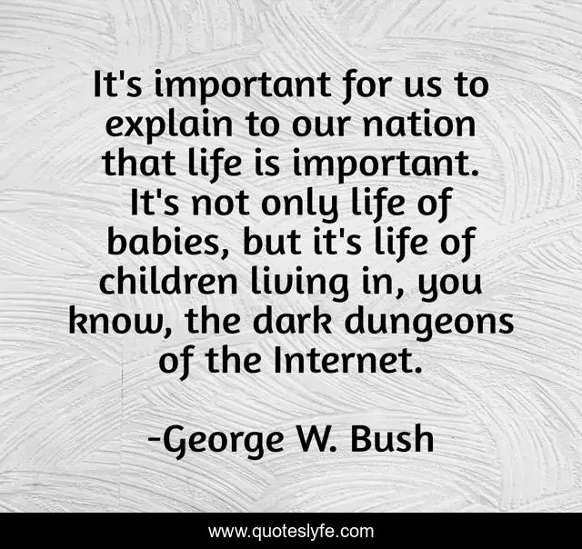 This page presents the quote "It's important for us to explain to our nation that life is important. It's not only life of babies, but it's life of children living in, you know, the dark dungeons of the Internet.". Author of this quote is George W. Bush. This quote is about dungeon, humor, living, babies, internet, bushism, children,.